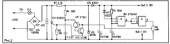Она состоит из диодного моста VD1…VD4, гасящего резистора R1, тиристора VS1, аналога однопереходного транзистора VT1, VT2, схемы задержки включения лампочки DD1, R5,C3.