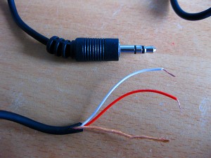 Под оплеткой он имеет 3 жилы: общий провод и 2 провода на правый и левый канал (у меня -- красный и белый). При сборке схемы нам понадобиться только 2 жилы – это общий провод и один из каналов (например, левый), второй канал останется не задействован