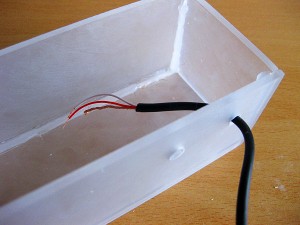 Перед началом сборки проденьте аудио шнур в отверстие на задней стенке короба цветомузыки